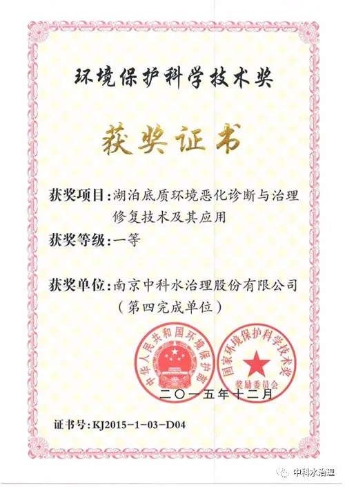 2015年,中科水治理技术获得国家环保部颁发的环境保护科学技术一等奖。