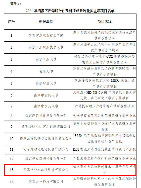 近日,我司科研项目《清水型生态系统构建技术应用研发及产业化》成功申报2021年栖霞区科技成果转化项目。这是公司在科研方面的持续投入及创新能力的不断提升,也是对公司研发实力的肯定。