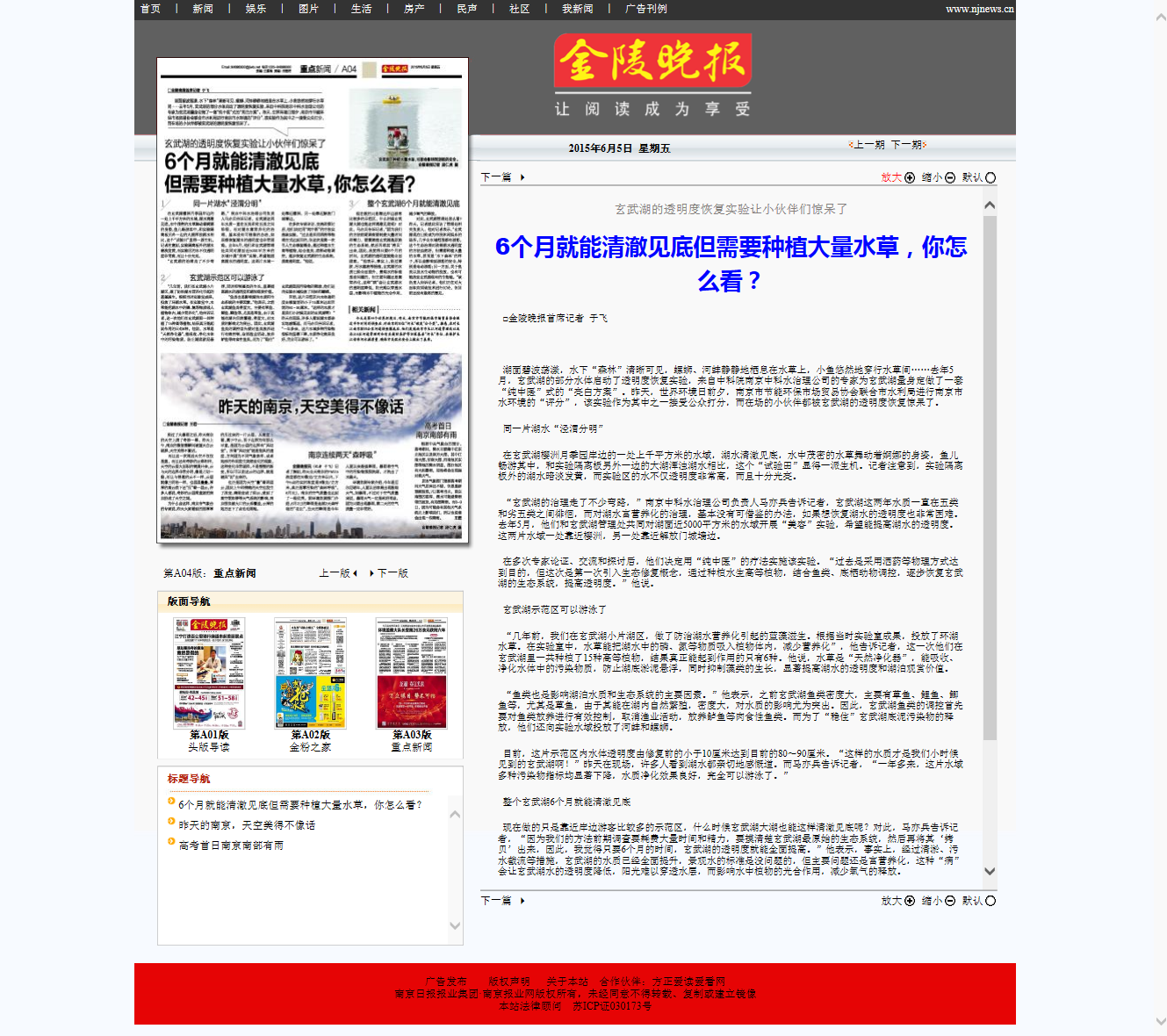 中国环保新闻网绿色南京频道对中科水治理采取的纯生态治水法表示赞扬,认为应该推广应用,并对水体透明度、水质治理效果给与积极肯定。