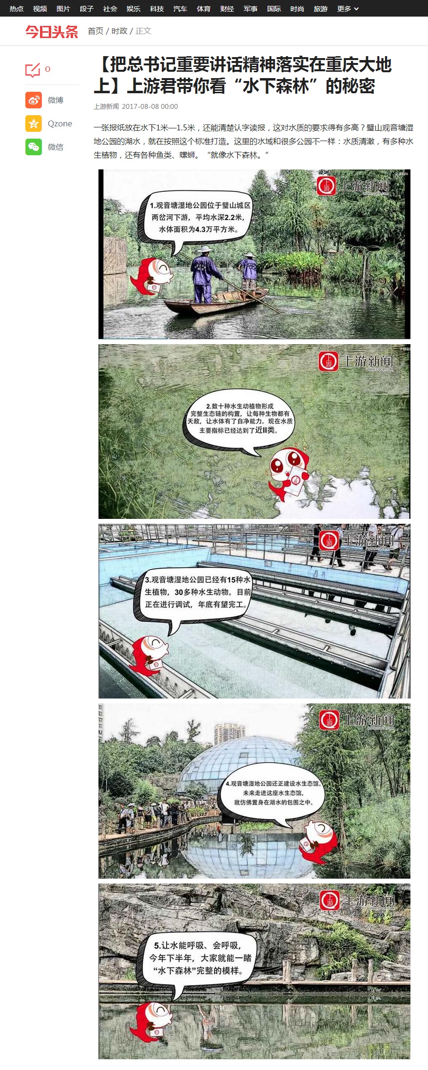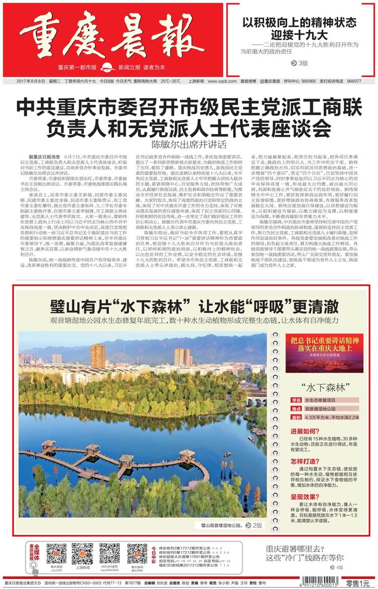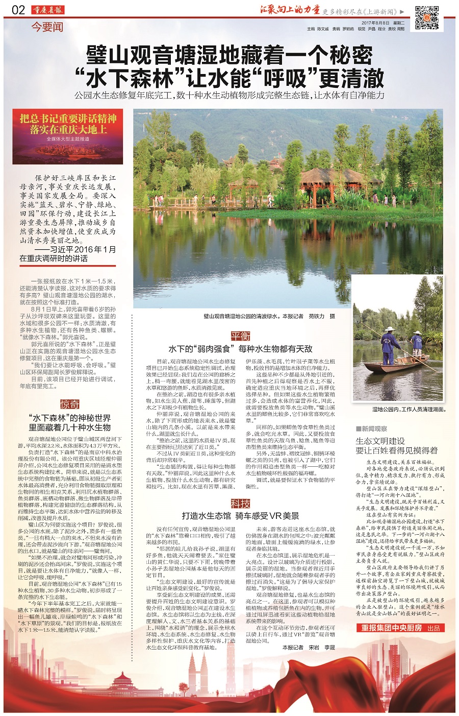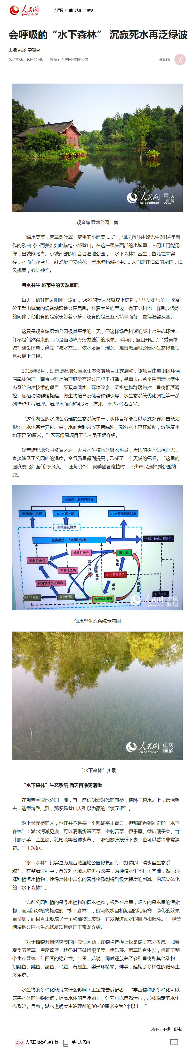 重庆日报、重庆之声、重庆电视台、重庆晚报、重庆晨报、重庆商报、华龙网、《当代党员》杂志社等市级主流媒体记者,来到观音塘湿地公园,实地探访了“水下森林”建设情况,采访了项目设计施工单位【南京中科水治理股份有限公司】工作人员。观音塘湿地公园项目是由中科水治理倾力打造的精品水生态修复项目,也是重庆市首个生态文明建设示范基地。