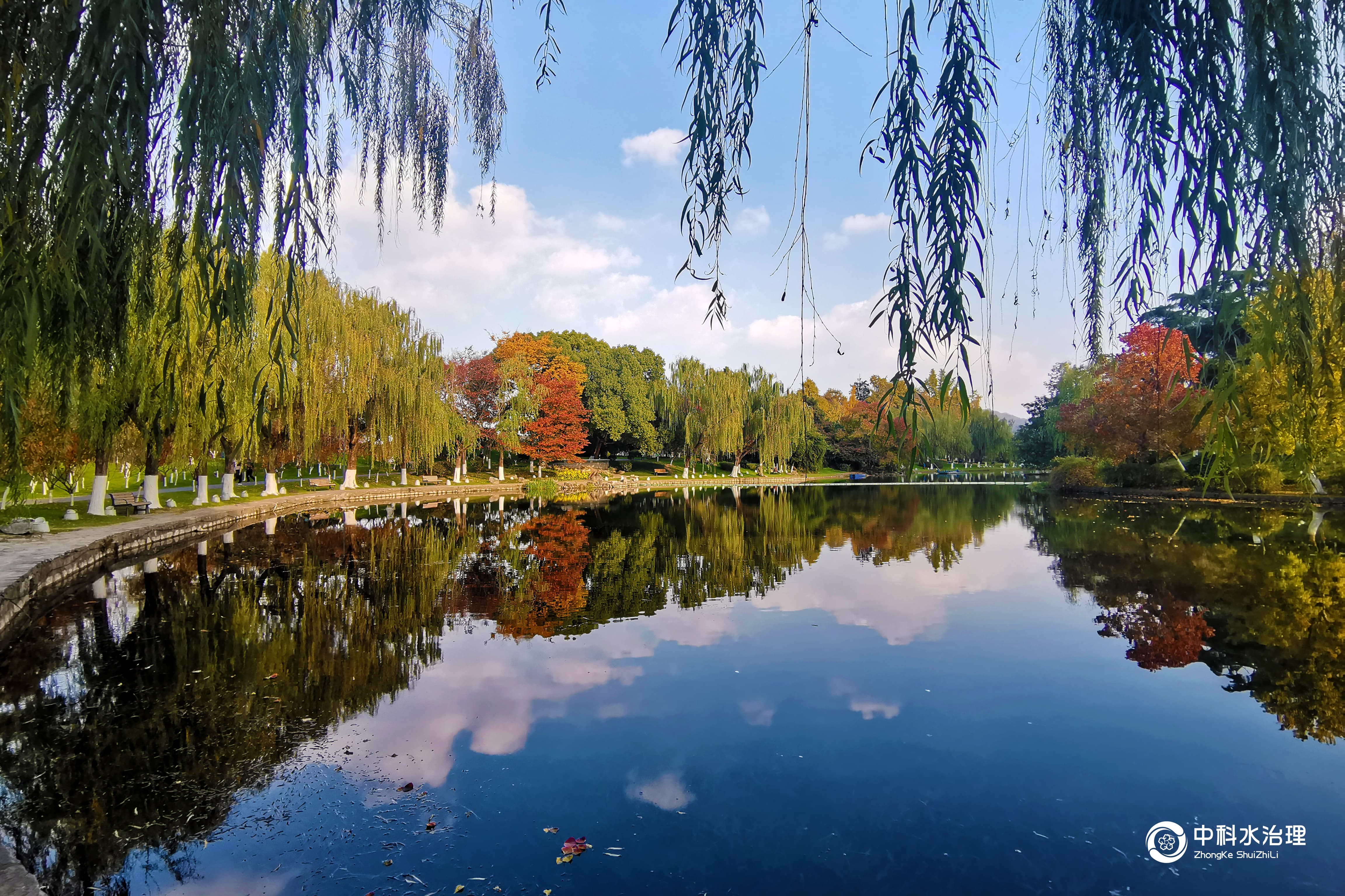 湖面水光潋滟,湖堤上植被色彩斑斓
